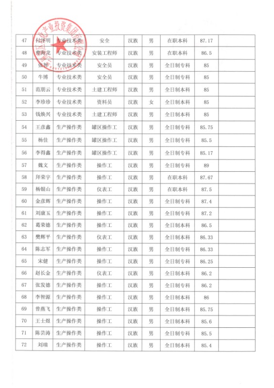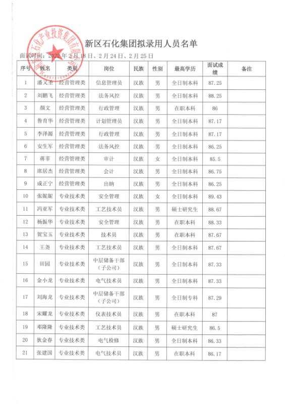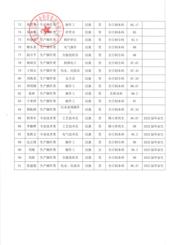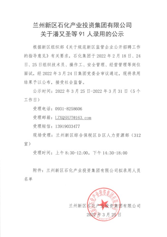 蘭州新區(qū)石化產(chǎn)業(yè)投資集團有限公司關(guān)于潘又圣等91人錄用的公示
