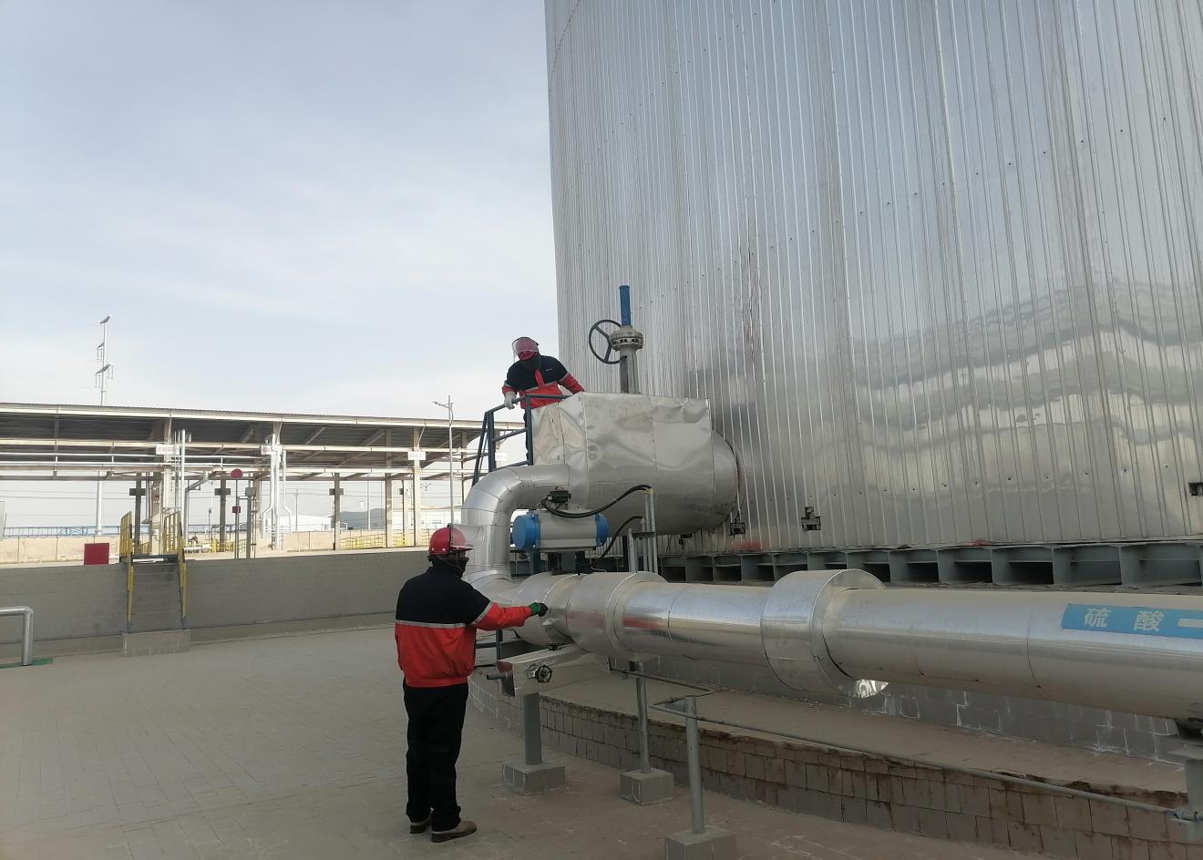 大年初一,接班后班組巡檢人員按照巡檢路線來到了硫酸罐區(qū)進行檢查,查看儲罐溫度、壓力、現(xiàn)場管線、閥門的狀態(tài)。數(shù)九寒天、滴水成冰,但絲毫不影響他們的工作熱情,他們嚴格按照巡檢規(guī)程操作,從裝卸棧臺到罐區(qū),從換熱站到倉庫,都留下了他們忙碌的身影。