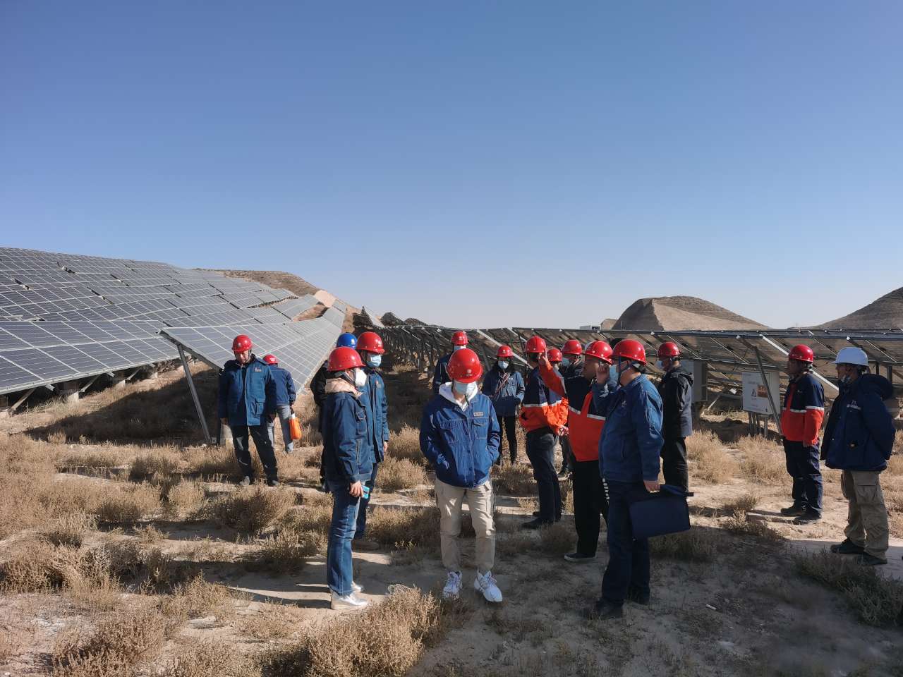 專精特新公司首先向蘭州供電公司和新區(qū)供電公司匯報(bào)該項(xiàng)目建設(shè)情況及目前手續(xù)辦理情況,并就相關(guān)問題做出解答。隨后,帶領(lǐng)蘭州供電公司及新區(qū)供電公司一行人員前往10MW光伏站場,國網(wǎng)專業(yè)人員對設(shè)備參數(shù)、線路配置、信號傳輸及場站安全等各方面進(jìn)行了詳細(xì)的詢問,并對現(xiàn)場設(shè)備及準(zhǔn)備運(yùn)行情況進(jìn)行了全面了解,就后期運(yùn)行提出了指導(dǎo)意見。