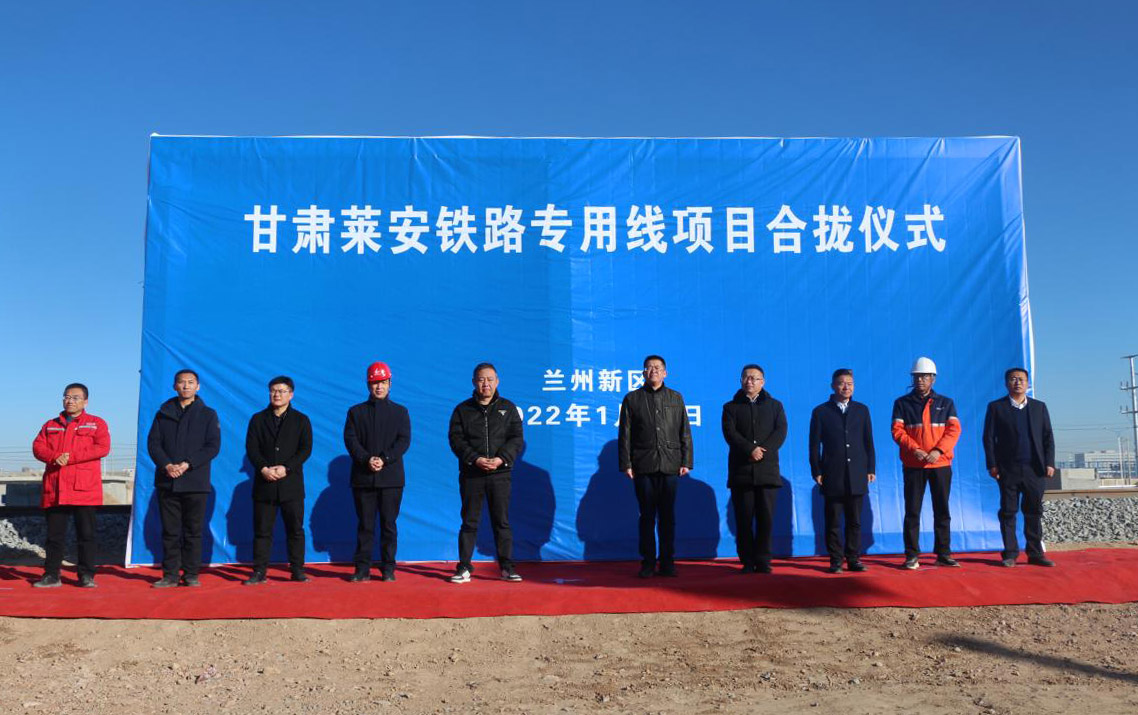 2022年1月19日上午10時,在化工物流園貨場舉行甘肅萊安鐵路專用線項目合攏儀式。蘭州新區(qū)石化集團(tuán)總經(jīng)理姜錦、蘭州新區(qū)商投集團(tuán)總經(jīng)理王堅民及中鐵二十一局、甘肅萊安能源有限公司領(lǐng)導(dǎo)出席儀式。