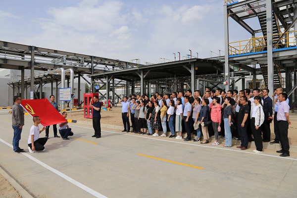 活動伊始,全體黨員俯瞰了化工園區(qū)整體建設(shè)情況,工作人員對石投集團全力打造的基礎(chǔ)配套設(shè)施管理運營、專精特新廠房集聚帶動、科技工程示范引領(lǐng)三大特色產(chǎn)業(yè)板塊進行了全面介紹。全體黨員走進石投集團專精特新產(chǎn)業(yè)園A區(qū)標準化專用廠房,看到了眾多入駐企業(yè)安裝設(shè)備、試車投產(chǎn)的火熱景象。在液態(tài)陽光示范項目現(xiàn)場,近距離參觀了解全球首套千噸級規(guī)模太陽燃料合成示范項目,并在項目現(xiàn)場,全體黨員面對鮮紅的黨旗,莊嚴地高舉右拳,鏗鏘有力地重溫入黨誓詞,將共產(chǎn)黨員的榮耀、責任和使命牢牢銘記在心中。