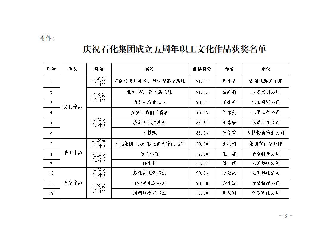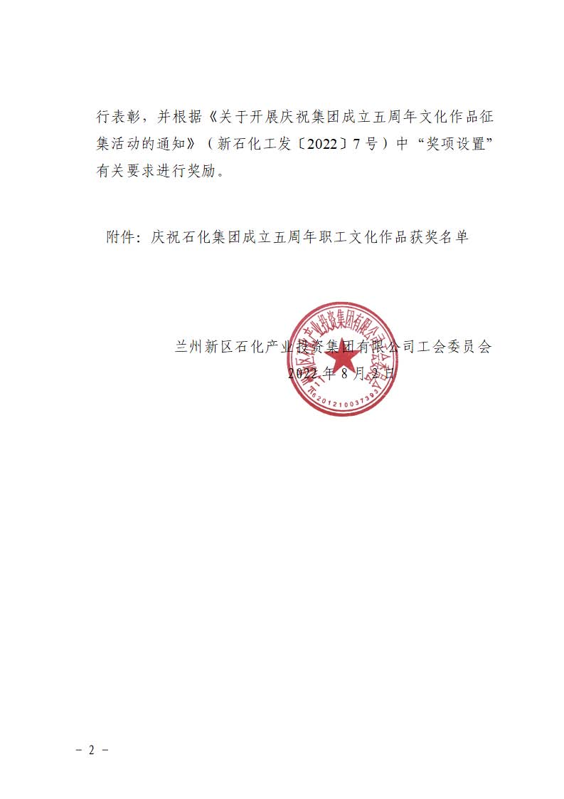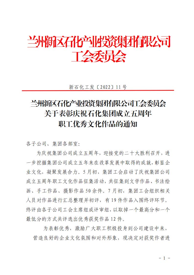 蘭州新區(qū)石化產(chǎn)業(yè)投資集團有限公司工會委員會 關于表彰慶祝石化集團成立五周年 職工優(yōu)秀文化作品的通知